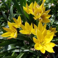 Тюльпан Ботанический Urumienses совершенно не похож на привычные сорта тюльпанов. Это невысокое растение с яркими желтыми цветами, похожими на звезды. 6 заостренных лепестков окрашены внутри в солнечный цвет, а снаружи бронзовые. Цветы располагаются среди листвы и полностью открываются только под солнечными лучами.